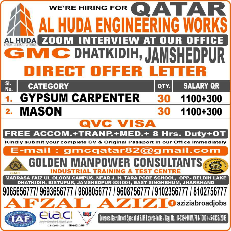 Golden Manpower Consultants is pleased to announce a new overseas job opportunity with AL HUDA ENGINEERING WORKS – a well-known company in Qatar. Interviews will be conducted via Zoom at our GMC Office in Jamshedpur.